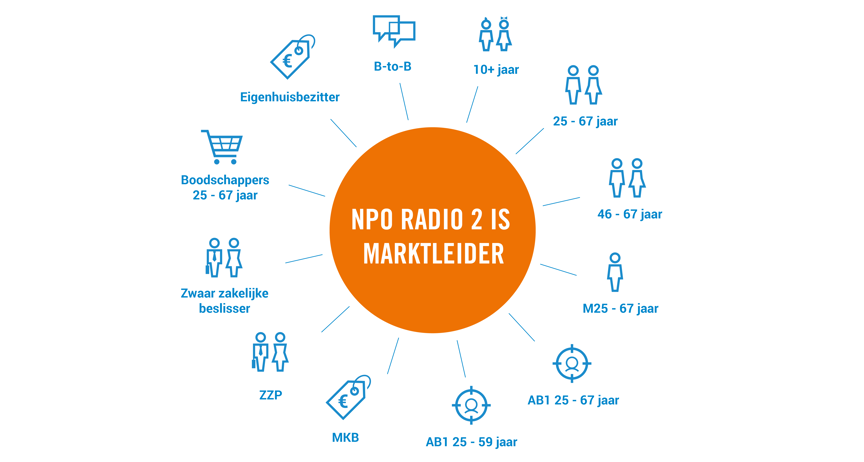Ook in 25-67 kopt de Top 2000-zender de lijst: met een aandeel van 14,6% is Radio 2 ook daar ruim marktleider. In maar liefst 10 andere doelgroepen staat NPO Radio 2 eveneens bovenaan. De zender is daarmee voor veel merken en doelgroepen interessant: