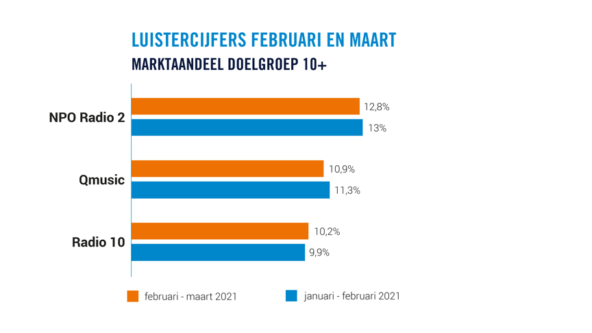 NPO Radio 2 staat al maanden aan top in 10+ en is met een marktaandeel van 12,8% opnieuw de populairste zender.